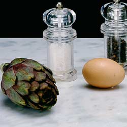 the harder leaves of the artichokes and cut the tops of the others. For