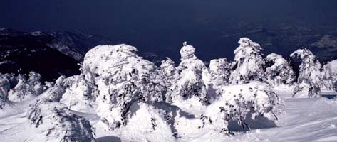 Si badi bene, tutta la zona é percorribile sia con gli sci da alpinismo che con quelli da fondo escursionismo ma a mio parere, data la particolare conformazione del territorio e soprattutto la fitta trama dei faggi che lo ricoprono quasi integralmente, esso é molto più adatto ad essere visitato con quell' antico mezzo di locomozione invernale che sono appunto le racchette da neve. Questi attrezzi, ritenuti ormai obsoleti, appesi da anni a chiodi arrugginiti di baite e rifugi, sono il frutto, almeno in Europa, della sapienza montanara, dell'arrangiarsi per poter continuare a muoversi da una frazione di montagna all'altra anche in caso di neve alta. Costruite in legno e budella essiccate d'animale, sono state elaborate fin dal lontano passato dalle popolazioni seminomadi delle zone artiche come gli Inuit, gli Athabaska o gli indiani Algonchini che le usavano per andare a caccia. Negli ultimi anni sono state riscoperte anche dall'industria dell'out door che le ha ristudiate e costruite in serie applicandovi tutte le ultime tecnologie e usando materiali più leggeri e moderni quali la plastica e le leghe d'alluminio.
