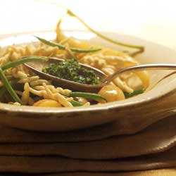 Toss the pesto with the pasta, adding the pasta-cooking liquid to the desired consistency. Turn into a warmed serving bowl and serve at once.