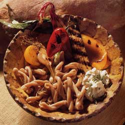 Farro is an ancient strain of wheat that is high in protein and very flavorful. The flour makes a dense and delicious pasta simply prepared with fresh seasonal vegetables. One of my favorite shapes is the twisted double strands of gemelli, or twins, produced by Rustichella d’Abruzzo.