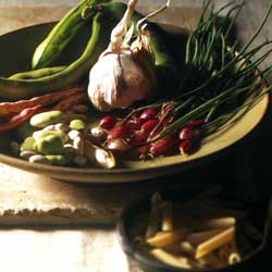 Toss the vegetable mixture with the pasta and turn into a warmed serving bowl. Stir in the Parmigiano-Reggiano, garnish with the zucchini flowers, and serve at once.