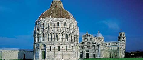 The religious heart of the city is somewhat off-centre and is a rather particular environment. Set on a green lawn, Piazza Dei Miracoli embodies the whole span of human existence: birth is represented by the Baptistery, the Tower symbolises the attainment of reason, the Cathedral that of sanctity, and death is represented by the Camposanto.