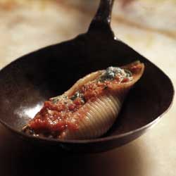 (Pasta Shells Stuffed with Ricotta with Sweet Peppers and Anchovy Sauce) |