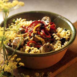 In a sauté pan over medium-high heat, heat the remain¬ing olive oil and brown the sausages 2 minutes on each side. Add the pepper mixture and olives and heat through. Keep warm over a low heat.